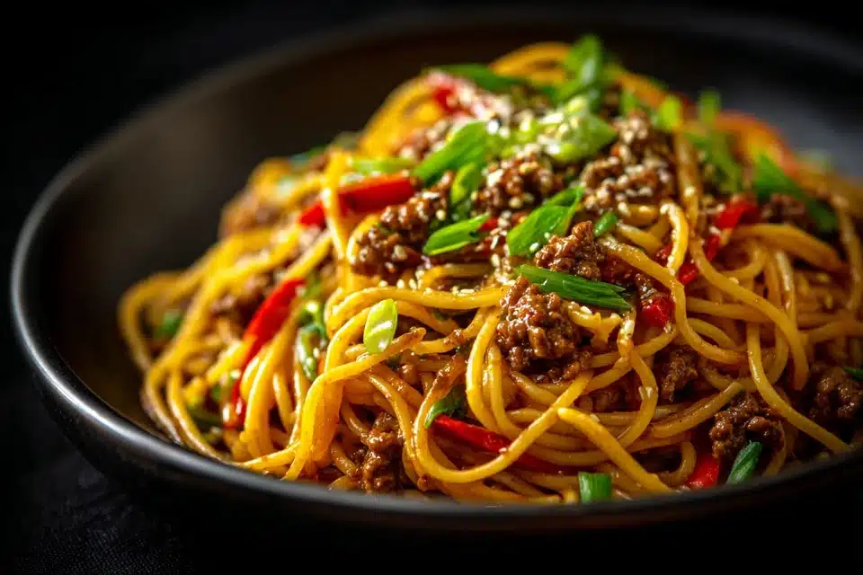 A bold, savory Asian-style fusion spaghetti dish with ground beef, crisp vegetables, and a sweet-salty garlic sesame sauce. Fast, flavorful, and perfect for weeknights.