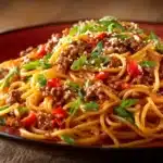 This Asian-style ground beef spaghetti brings together the hearty comfort of Italian pasta with the bold, savory flavors of your favorite Asian stir-fry. Think tender noodles coated in a soy-based, garlic-sesame sauce, mixed with juicy ground beef and crisp vegetables—ready in under 30 minutes.