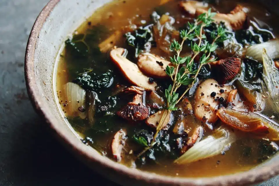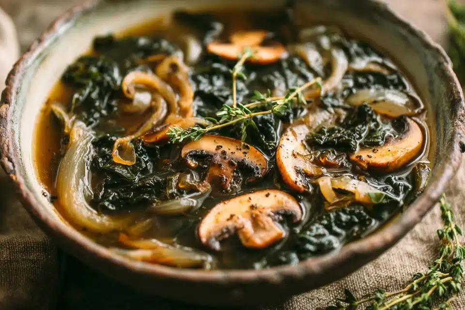 A warm, nourishing soup made with wild mushrooms, sweet caramelized onions, and earthy kale. Rustic, vegan, and full of flavor.