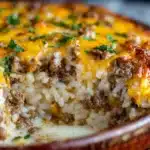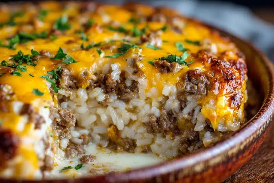 This cheesy ground beef and rice casserole is a classic, comforting one-dish meal made with seasoned beef, tender rice, creamy sauce, and melty cheddar cheese—perfect for family dinners or meal prep.