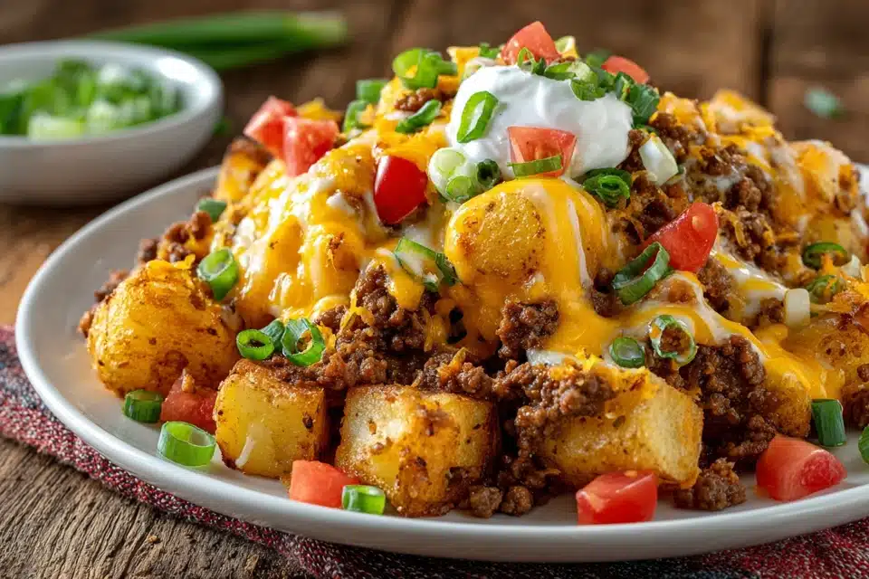 Crispy roasted potatoes layered with seasoned taco beef and gooey cheese. Topped with sour cream, salsa, and fresh herbs for a comforting, satisfying dish.