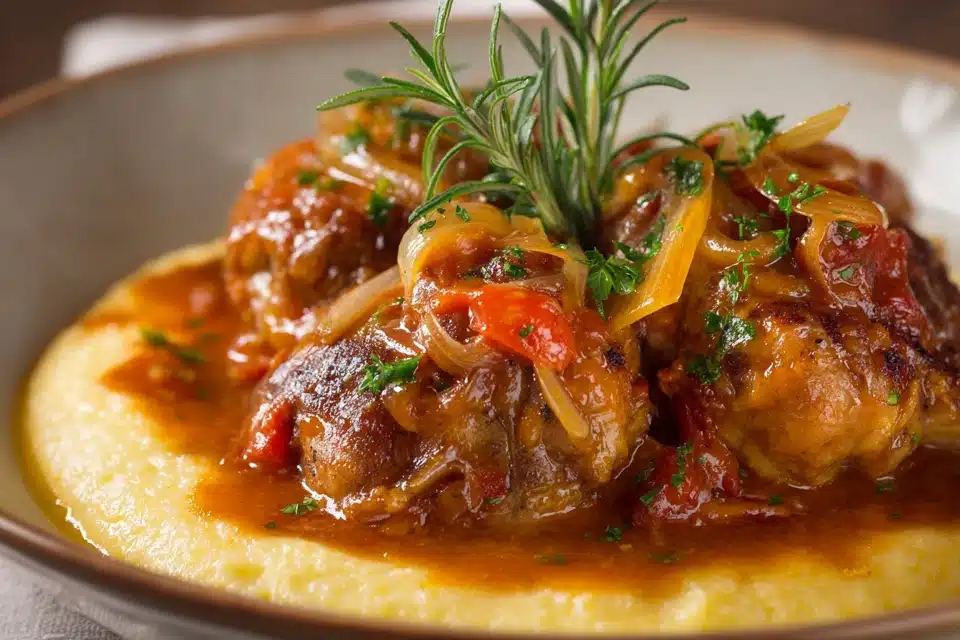 The chicken becomes incredibly tender as it braises, while the sauce thickens into a rich, aromatic gravy perfect for spooning over creamy polenta, mashed potatoes, or crusty bread. A final sprinkle of gremolata—lemon zest, garlic, and parsley—adds brightness that cuts through the savory base.