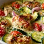 Bake uncovered for 30–35 minutes, or until the chicken is cooked through (165°F internal temp), the zucchini is tender, and the cheese is melted and golden.