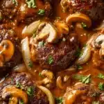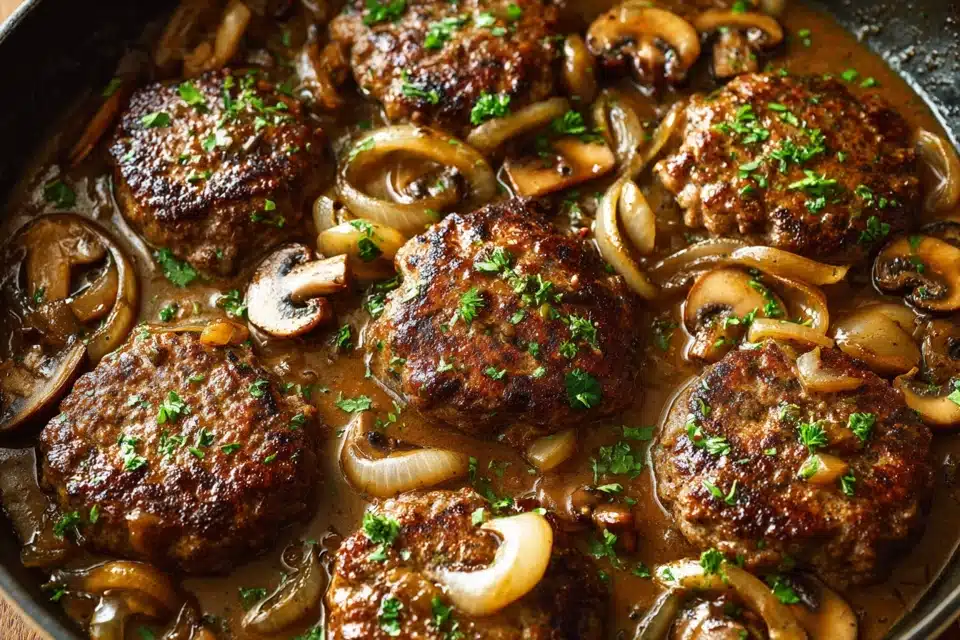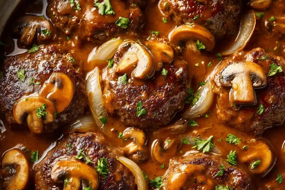 Juicy, seasoned beef patties simmered in a rich mushroom-onion gravy—classic comfort food at its best.