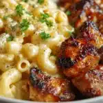 - Assemble and serve: Spoon mac & cheese into bowls or plates. Top with honey garlic butter chicken and a drizzle of extra glaze. Garnish with fresh parsley or green onions if desired.