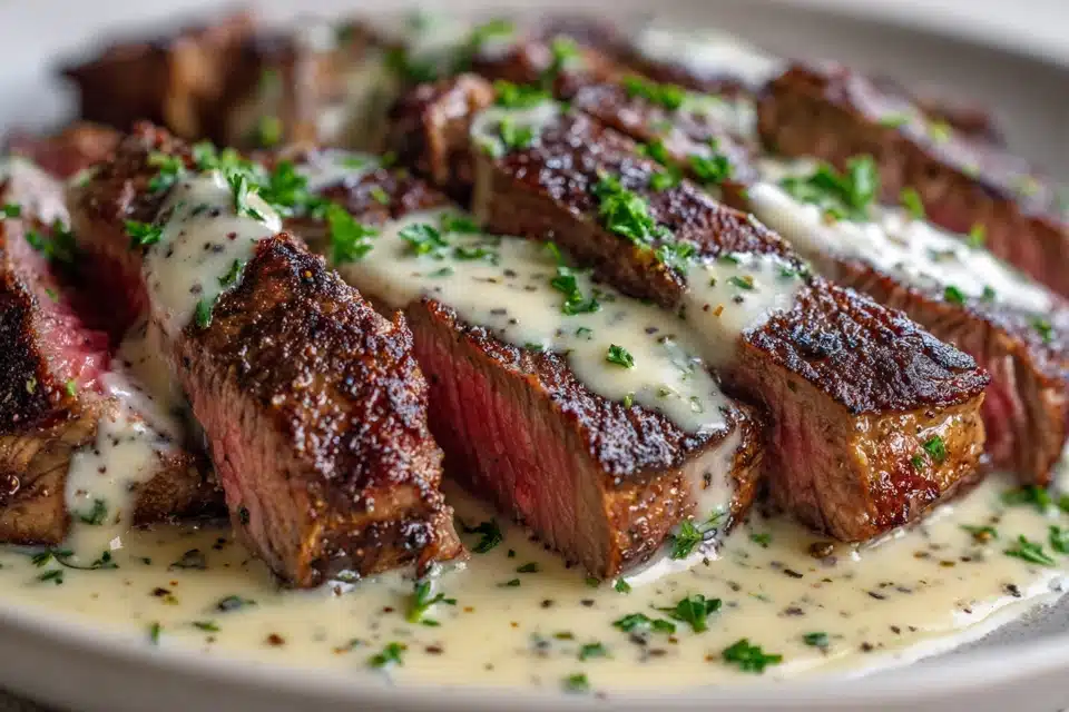 A juicy, pan-seared steak topped with a silky, savory garlic cream sauce—easy to make at home and packed with rich, indulgent flavor.