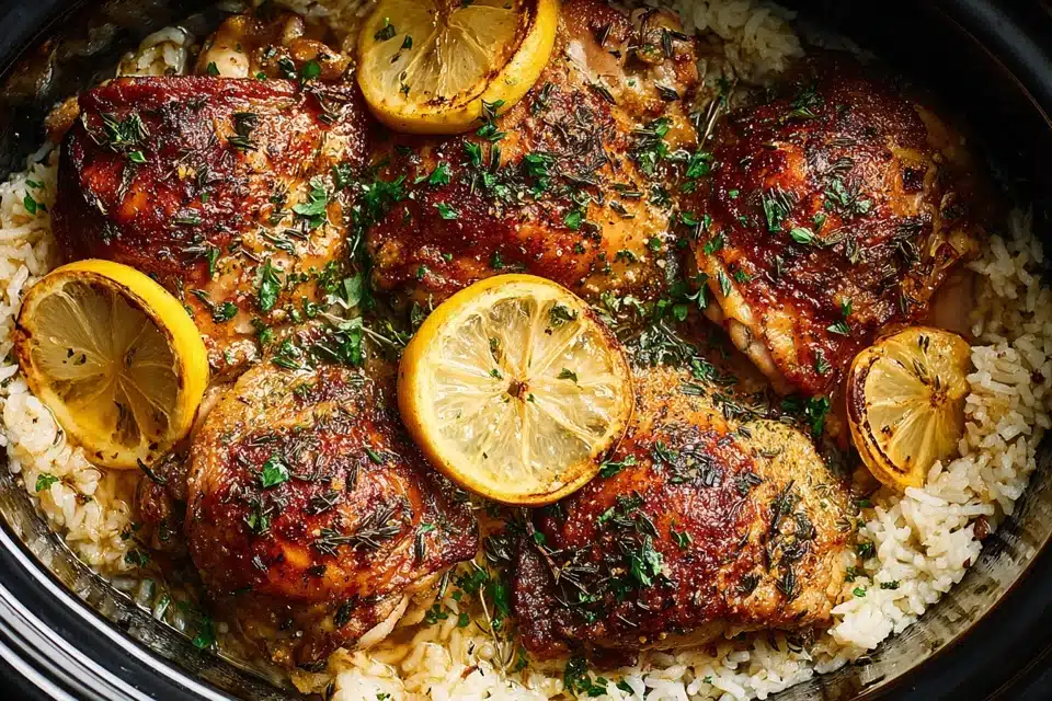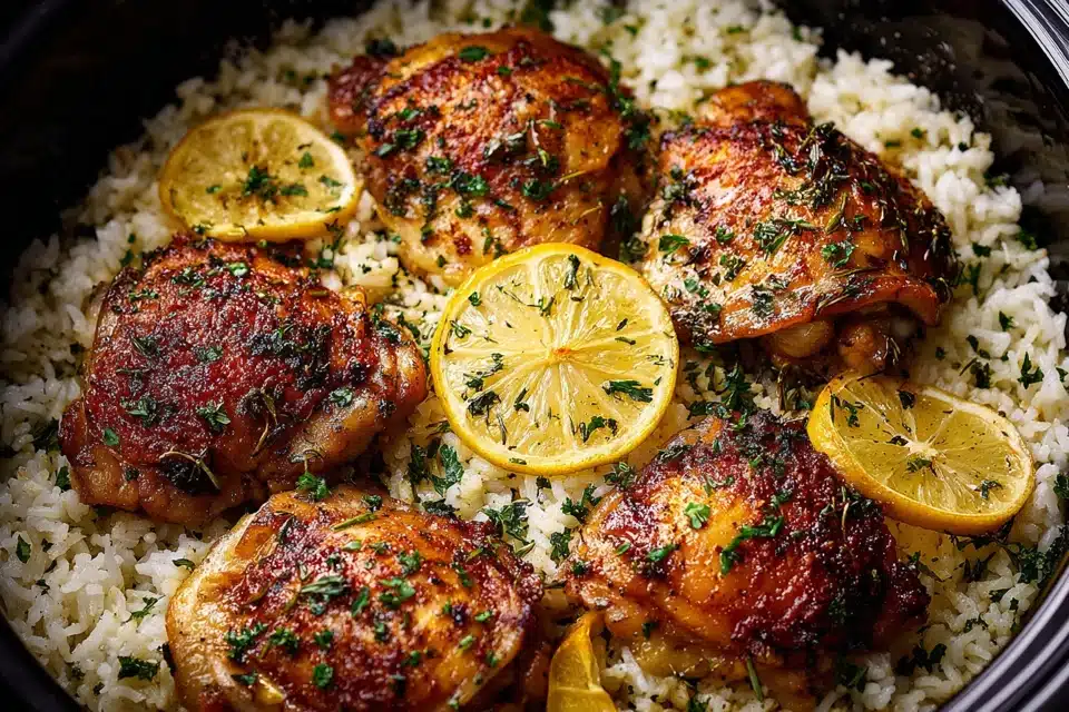 A bright and comforting slow cooker meal made with juicy chicken thighs, fluffy rice, fresh lemon, and fragrant herbs. Perfect for meal prep or easy dinners.