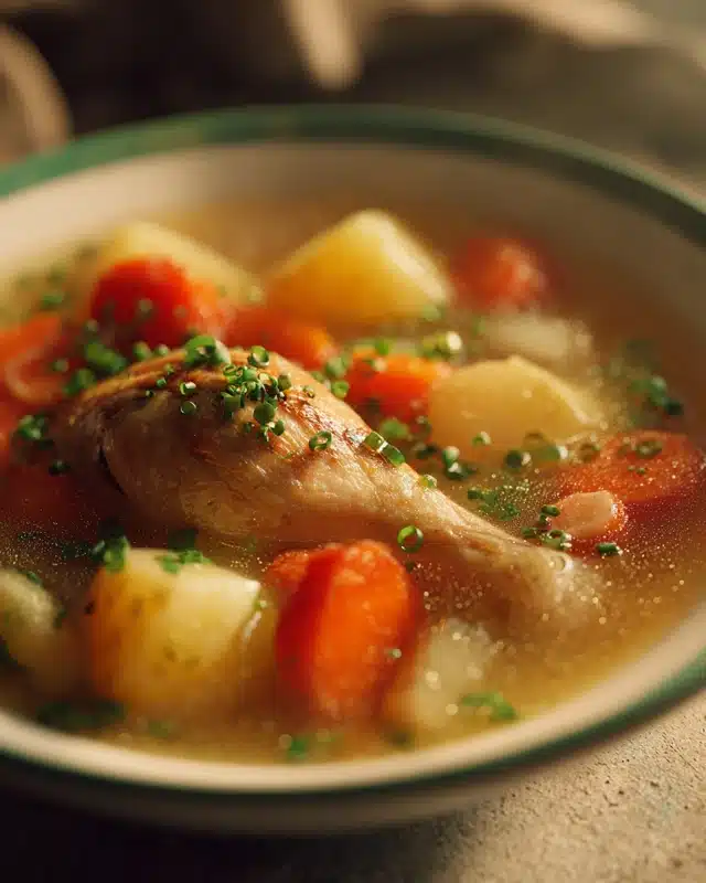 Bring to a boil, then lower to a gentle simmer. Cover and simmer for 45–60 minutes, or until chicken is tender and veggies are soft but not mushy.