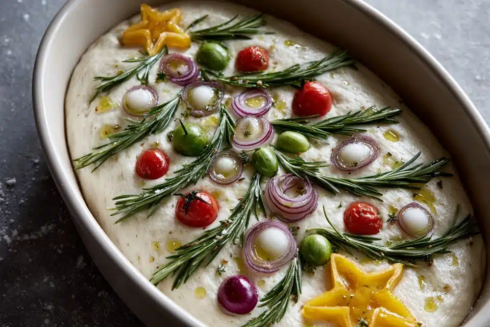 Brush the surface generously with olive oil. Now comes the fun part — decorating! Arrange rosemary sprigs diagonally like tree boughs. Add halved cherry tomatoes as ornaments, sliced olives as baubles, red onion as garlands, and bell pepper stars or rings.