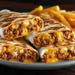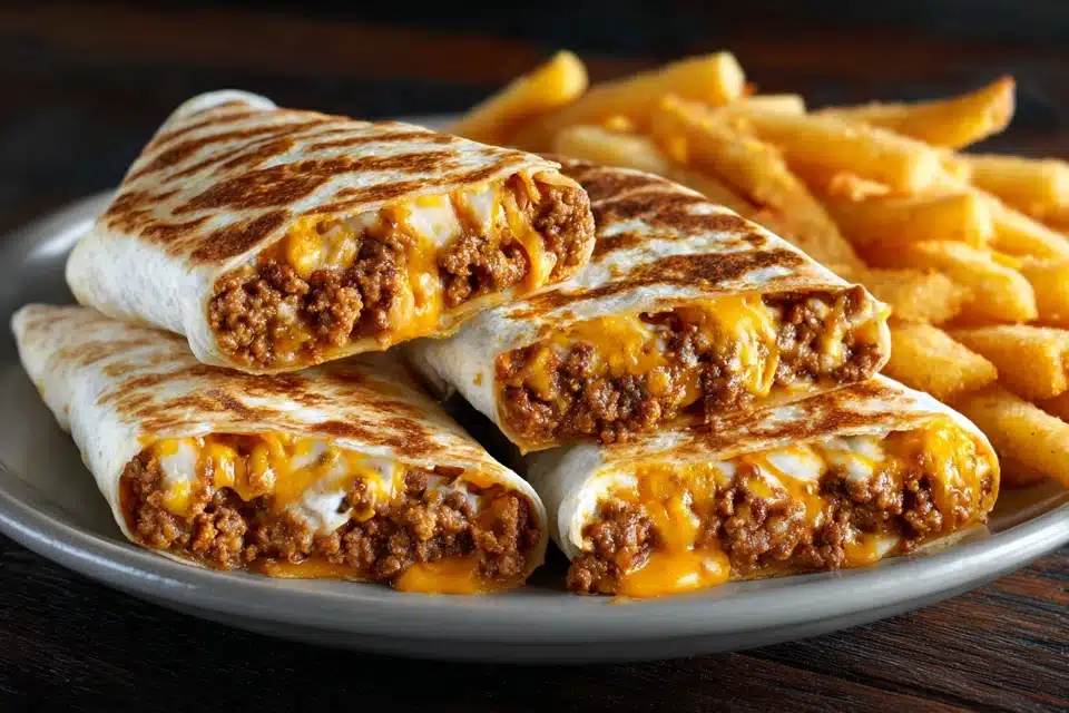 Cheesy beef burritos stuffed with seasoned ground beef, melty cheese, and crispy fries — served hot and wrapped in a soft tortilla for the ultimate comfort food.