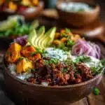 Inspired by viral meal-prep trends, this bowl is a true powerhouse. It’s easy to assemble, naturally gluten-free, and perfect for weeknight dinners or prepped lunches. The flavor combo of spiced meat, cool cheese, and sticky hot honey makes every bite crave-worthy.