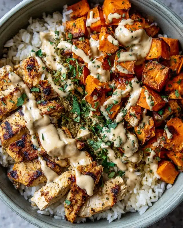 Tender roasted sweet potatoes, juicy seasoned chicken, fluffy rice, and crisp veggies come together in one delicious bowl. It’s customizable, family-friendly, and naturally gluten-free—with easy dairy-free and low-carb swaps.