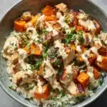 Tender roasted sweet potatoes, juicy seasoned chicken, fluffy rice, and crisp veggies come together in one delicious bowl. It’s customizable, family-friendly, and naturally gluten-free—with easy dairy-free and low-carb swaps.