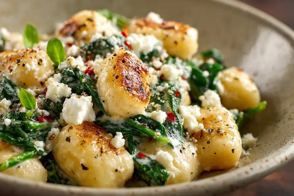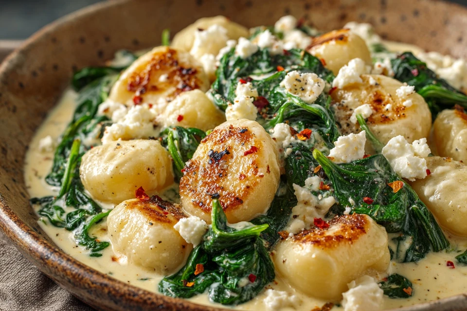 A healthy and comforting one-pan dinner featuring golden pan-seared gnocchi, tender spinach, and creamy feta in a light, velvety sauce.