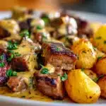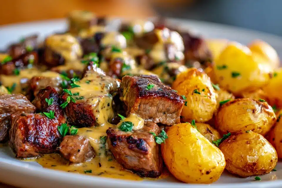 A rich, high protein one-pan dish of seared steak bites and golden potatoes in a creamy honey butter garlic sauce. Comforting, quick, and deeply satisfying.