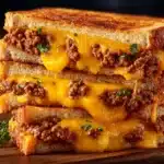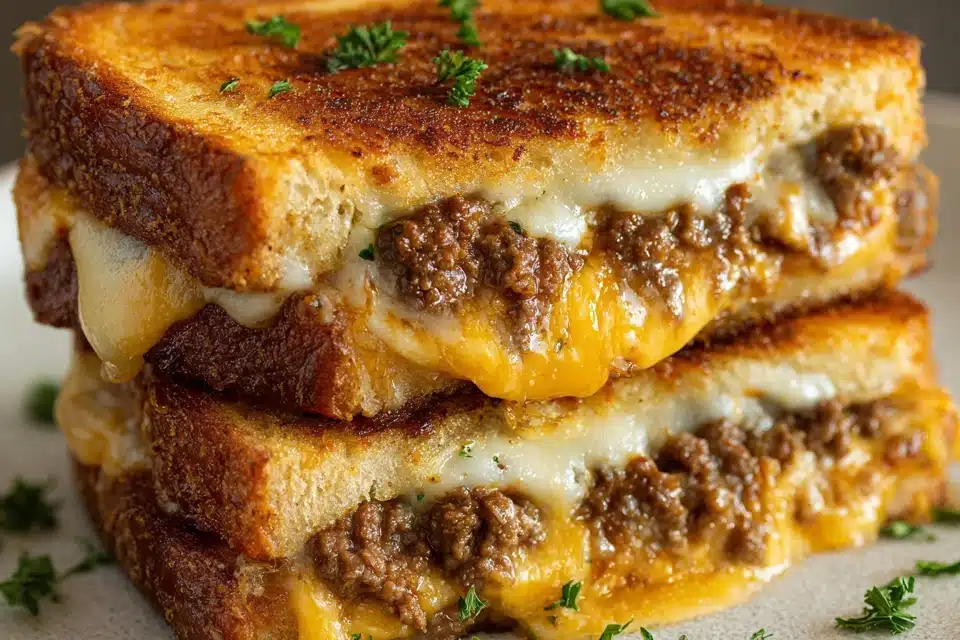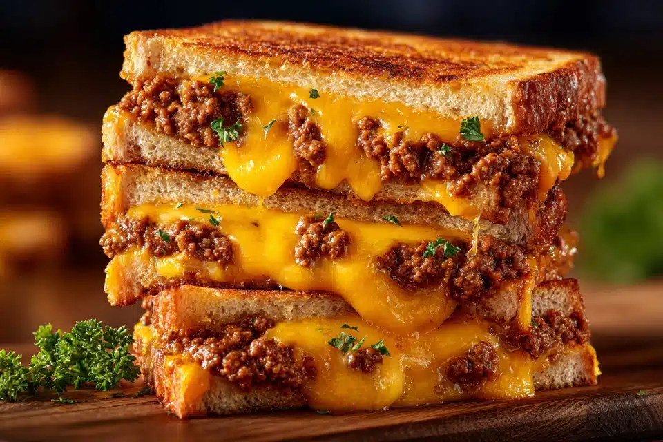 A golden, crispy sandwich loaded with savory seasoned ground beef and melty cheese — the ultimate comfort food made in one pan and ready in minutes.