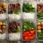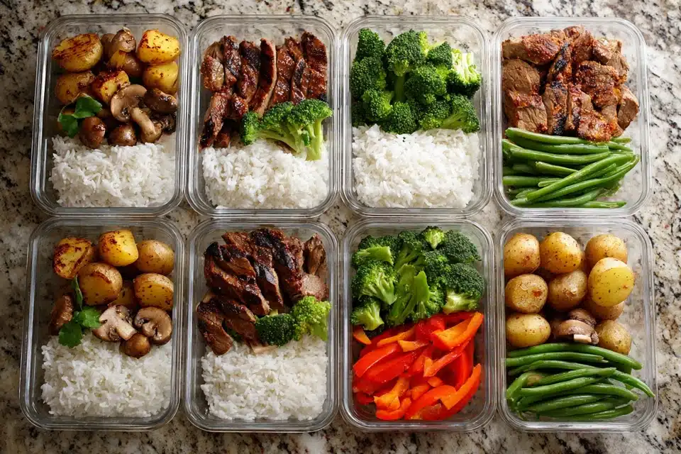 Description: A balanced and colorful meal prep recipe featuring grilled chicken, beef strips, and saucy chicken bites paired with rice or roasted potatoes and a medley of fresh vegetables.
