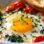 Mediterranean Baked Feta Eggs are the ultimate savory breakfast — rich, tangy, and deeply satisfying. Inspired by traditional Mediterranean flavors, this dish combines creamy feta cheese, jammy eggs, and a vibrant tomato-pepper base, all baked to perfection in one skillet. It’s reminiscent of shakshuka, but creamier and brighter thanks to the baked feta twist.