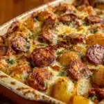 Cheesy Ranch Potatoes and Smoked Sausage is a hearty, satisfying dish packed with smoky, creamy, cheesy flavor—all baked in one pan for easy cleanup. Tender roasted potatoes are tossed in zesty ranch seasoning, melted cheddar, and juicy slices of smoked sausage for a comforting weeknight dinner that’s guaranteed to disappear fast.
