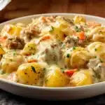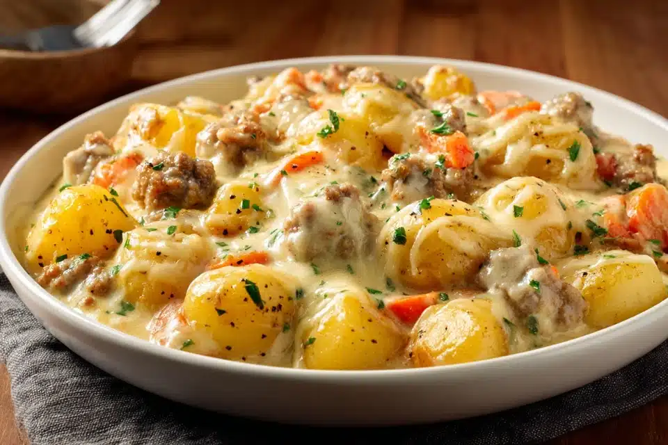 This creamy one-skillet meat and potato dinner comes together in 30 minutes with ground beef, tender potatoes, and a rich garlic herb sauce. Perfect for busy weeknights and family meals.
