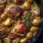This modern twist brings out those same warm, comforting flavors using bone-in chicken thighs simmered in apple cider, sautéed apples, shallots, and fresh thyme. The result? Juicy, flavorful chicken coated in a silky cider cream sauce with subtle sweetness and savory depth.