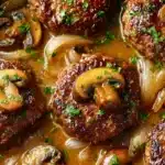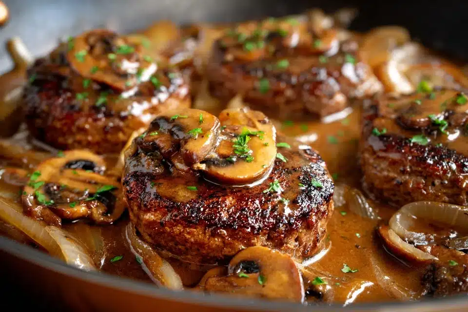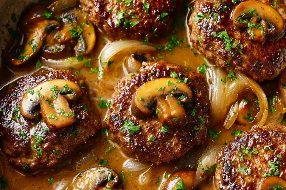Juicy beef patties simmered in rich onion-mushroom gravy. Classic comfort food made easy in one skillet.