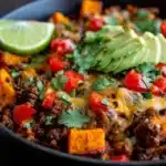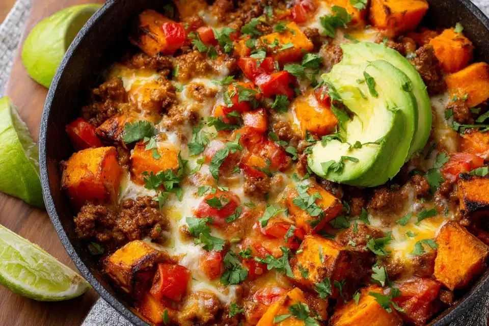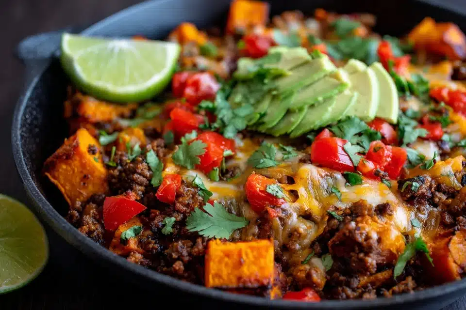 A one-pan Southwest-style ground beef and sweet potato skillet packed with protein, bold spices, and vibrant veggies. Perfect for busy nights or healthy meal prep.