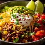 Layered with seasoned ground beef or turkey, fluffy rice, beans, veggies, and your favorite toppings, this bowl delivers all the Tex-Mex flavor you love — in a fresh, wholesome format. Great for meal prep, family dinners, or DIY taco nights without the mess of tortillas.