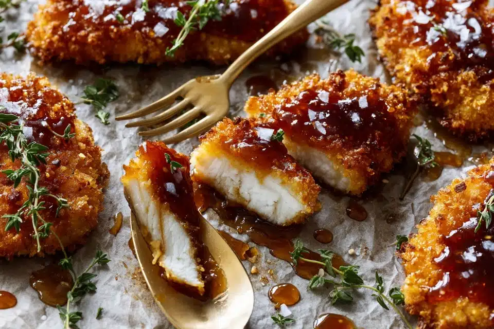 Crispy oven-baked chicken coated in golden breadcrumbs and finished with a sticky, spicy-sweet hot honey glaze. Sweet, spicy, and crunchy — without frying.
