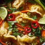 This cozy Thai potsticker soup features tender dumplings in a fragrant coconut-lime broth, infused with red curry, lemongrass, and fresh herbs for a warming, flavorful meal ready in under 30 minutes.