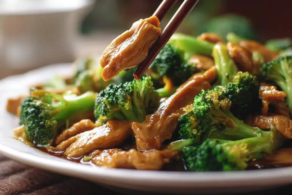 A classic Chinese-style stir fry made with tender chicken, crisp broccoli, and savory sauce served over white rice.