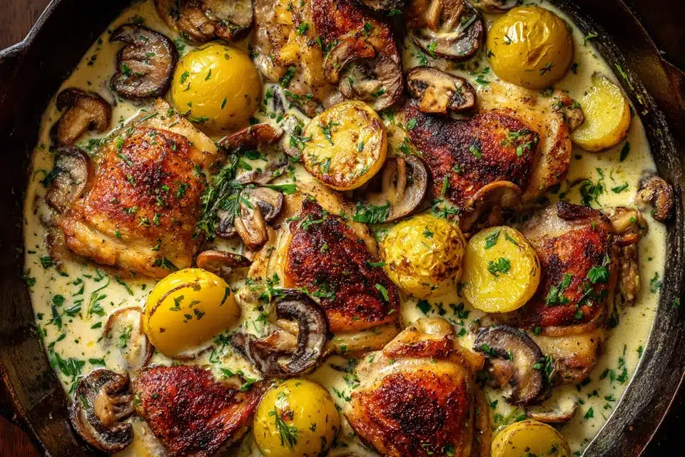 Golden, herb-roasted chicken baked with tender potatoes and mushrooms in a rich, creamy white sauce. A cozy one-pan dinner full of flavor and comfort.