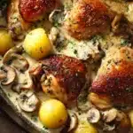 Golden, herb-roasted chicken baked with tender potatoes and mushrooms in a rich, creamy white sauce. A cozy one-pan dinner full of flavor and comfort.